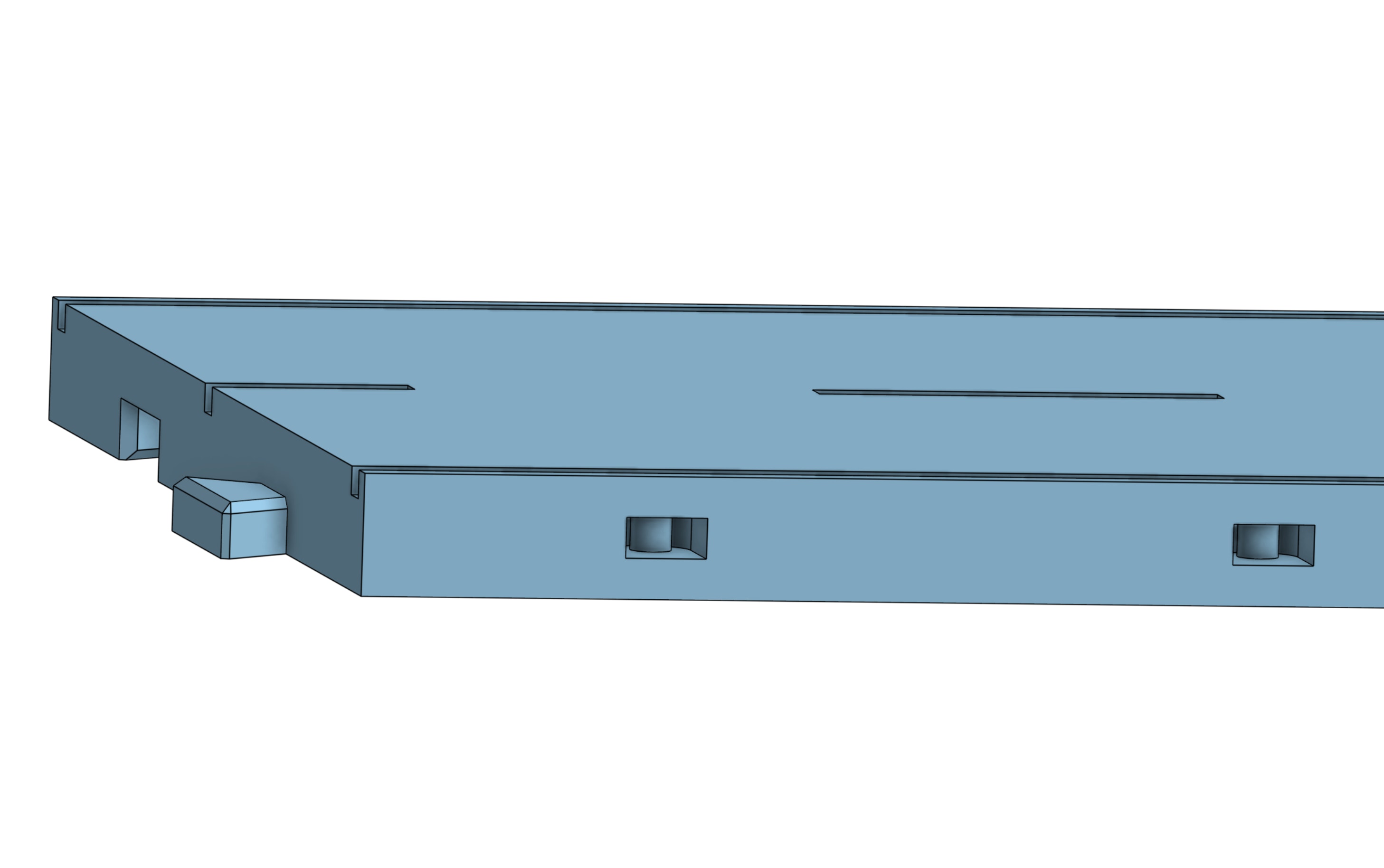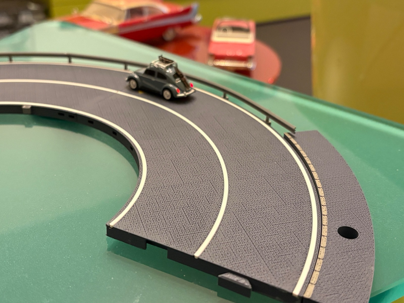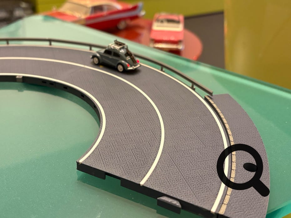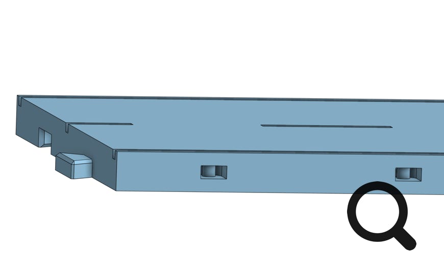 Um Zubehörteile wie Leitplanken, Trottoirs, Verkehrsschilder, Wegweiser, etc. an die Platten anzubringen, kann man diese mit den entsprechenden Vorkehrungen ausrüsten. Sie werden seitlich beidseitig an den senkrechten Fahrbahn-Rändern versenkt angebracht.