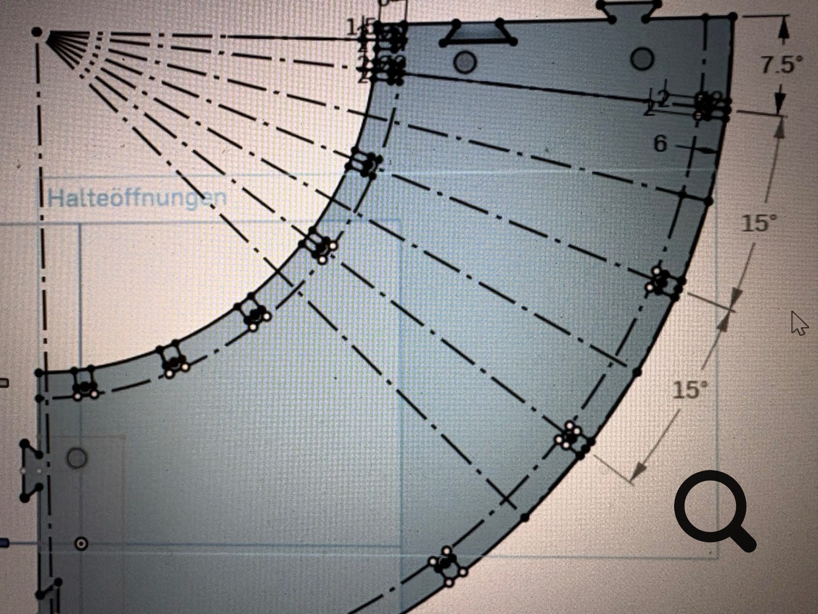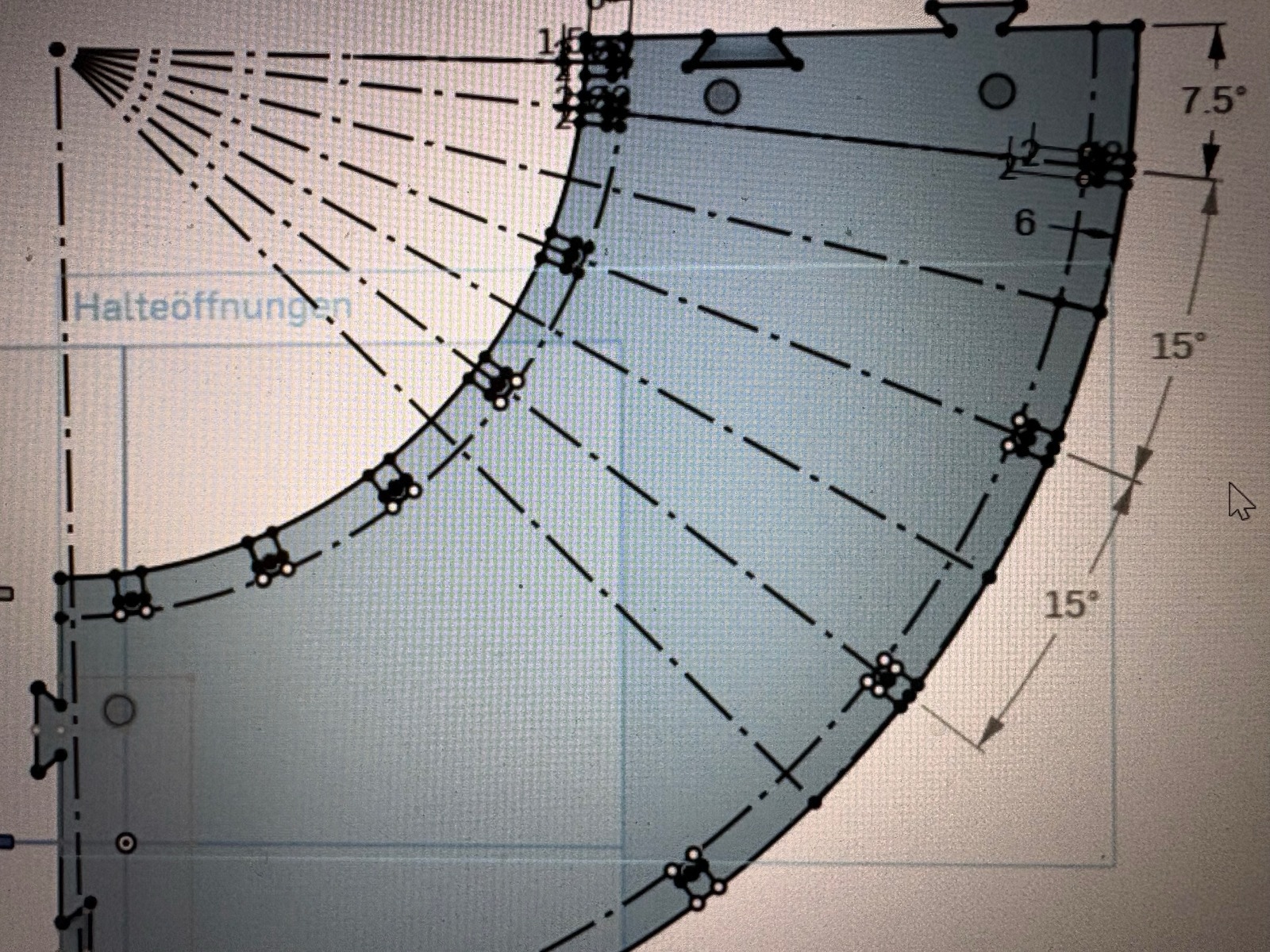 Bei den gebogenen Platten haben die Aussparungen einen Winkel von 15° zueinander, beginnend mit 7.5° von der Stirnseite der Platte.