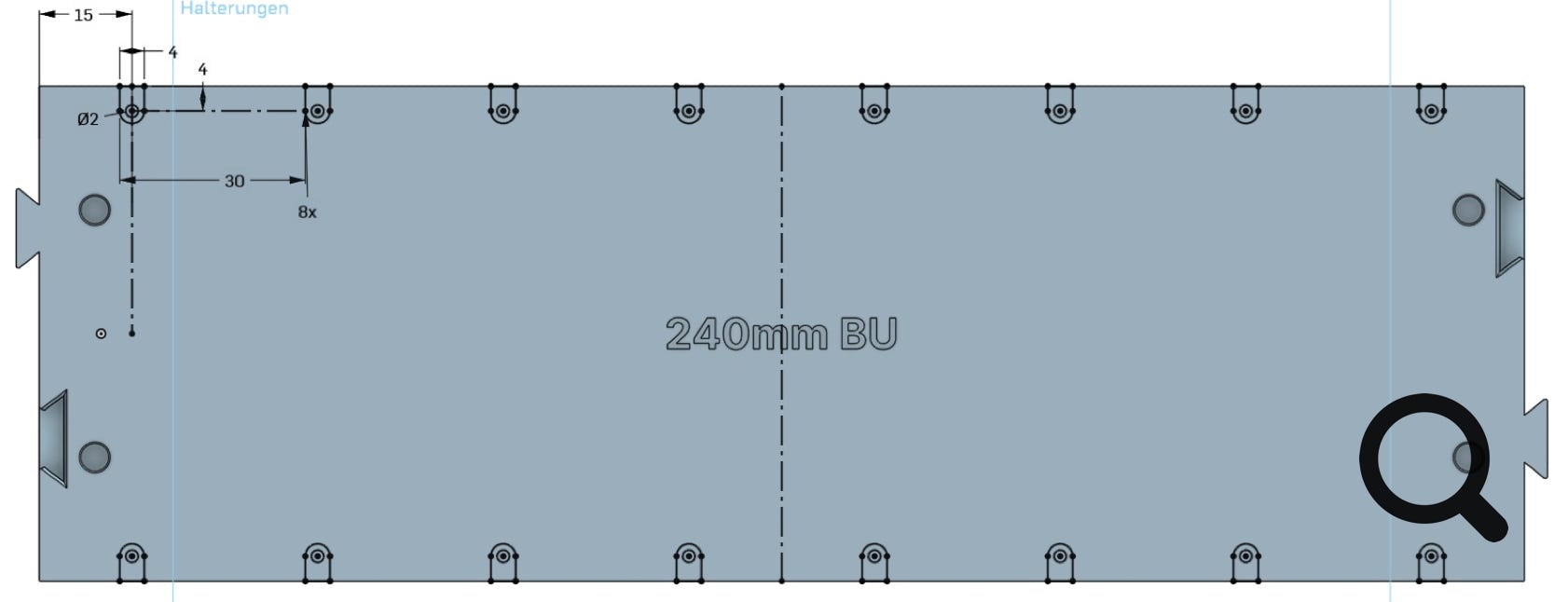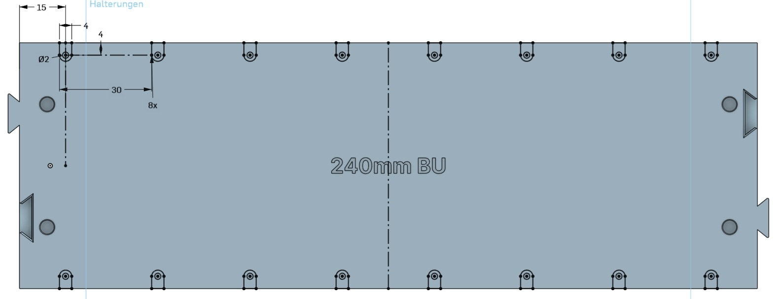 Bei den geraden Platten haben die Aussparungen einen Abstand von 30 mm zueinander, beginnend mit 15 mm von der Stirnseite der Platte.